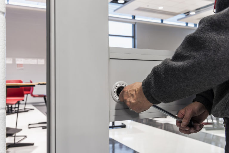 The insulated glass inserts meet LEED daylighting requirements and is designed to stop as high as 44 dB of sound from traveling from one room to another. The panels effectively keep the ambient sound levels within the rooms at levels required (35 dB) for optimal learning. To further control sound flanking, the operable partitions use a lever closure panel, an expandable closure that provides force across the entire system to squeeze the panels together. The 200 pounds of force create a tight panel-to-panel bond, preventing sound from leaking between the panel joints.